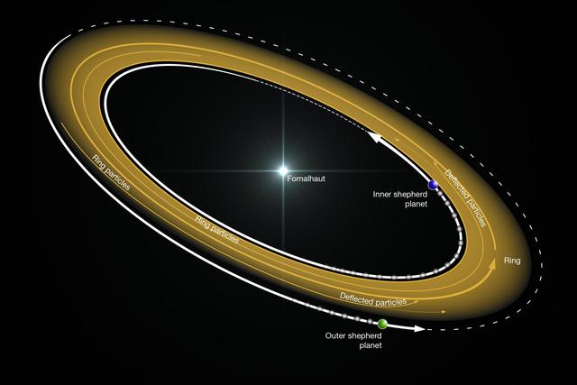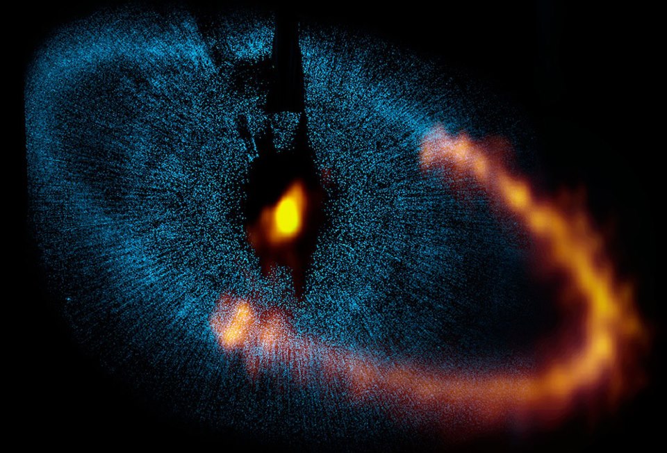 Η εικόνα απεικονίζει τον δακτύλιο σκόνης που υπάρχει γύρω από ένα αστέρι που ονομάζεται Fomalhaut. Το βασικό χρώμα της φωτογραφίας, μπλε, είναι από μια παλιότερη λήψη που έγινε από το διαστημικό τηλεσκόπιο Hubble. Πλέον, το τηλεσκόπιο ALMA, διαθέτοντας μεγαλύτερη ευκρίνεια έδωσε την λήψη όπως την βλέπουμε στη πρώτη εικόνα. Αυτό έχει ως αποτέλεσμα, οι επιστήμονες να μπορούν να λαμβάνουν περισσότερα δεδομένα προς μελέτη, αν και έχει παρατηρηθεί ένα μόνο μέρος του αστεριού μέχρι στιγμής.