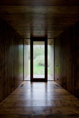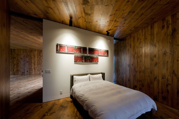 Ένας άκρως αποτελεσματικός σχεδιασμός, το σχήμα Υ, χρησιμοποιήθηκε για να συνδέσει τα παραπάνω 3 στοιχεία, το κάθε ένα από αυτά στη δική του ξεχωριστή θέση, καθορίζοντας τη συνολική εμφάνιση του ξενώνα. Το μικρό μπάνιο, η κουζίνα και η ντουλάπα που αποτελεί ξεχωριστό χώρο και κρύβει μέσα την σκάλα που οδηγεί στο υπόγειο και στο γκαράζ, απαρτίζονται από αυτόνομα “κουτιά” τα οποία λειτουργούν και ως πίσω τοίχοι του υπνοδωματίου και του χώρου εργασίας.