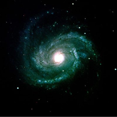 Η (υπέρυθρη) φωτογραφία απεικονίζει τις σπείρες του γαλαξία Messier 100 να στροβιλίζονται. Η φωτογραφία πάρθηκε από το τηλεσκόπιο Spitzer Space της NASA.